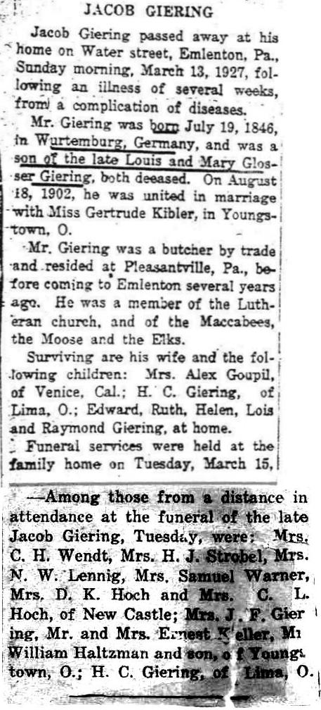 Giering, Jacob 80 died at home in Emlenton Sun. Survived by widow & children Henry of Lima, Oh; Edward, Raymond, Misses Ruth, Lois, Helen of Emlenton; Mrs Alexander, Venice, Ca.NOTE: it is believed that the reference to "Mrs Alexander" is incorrect. It is most likely a reference to Alice who married one "L. Group", Groupe or Groupel.